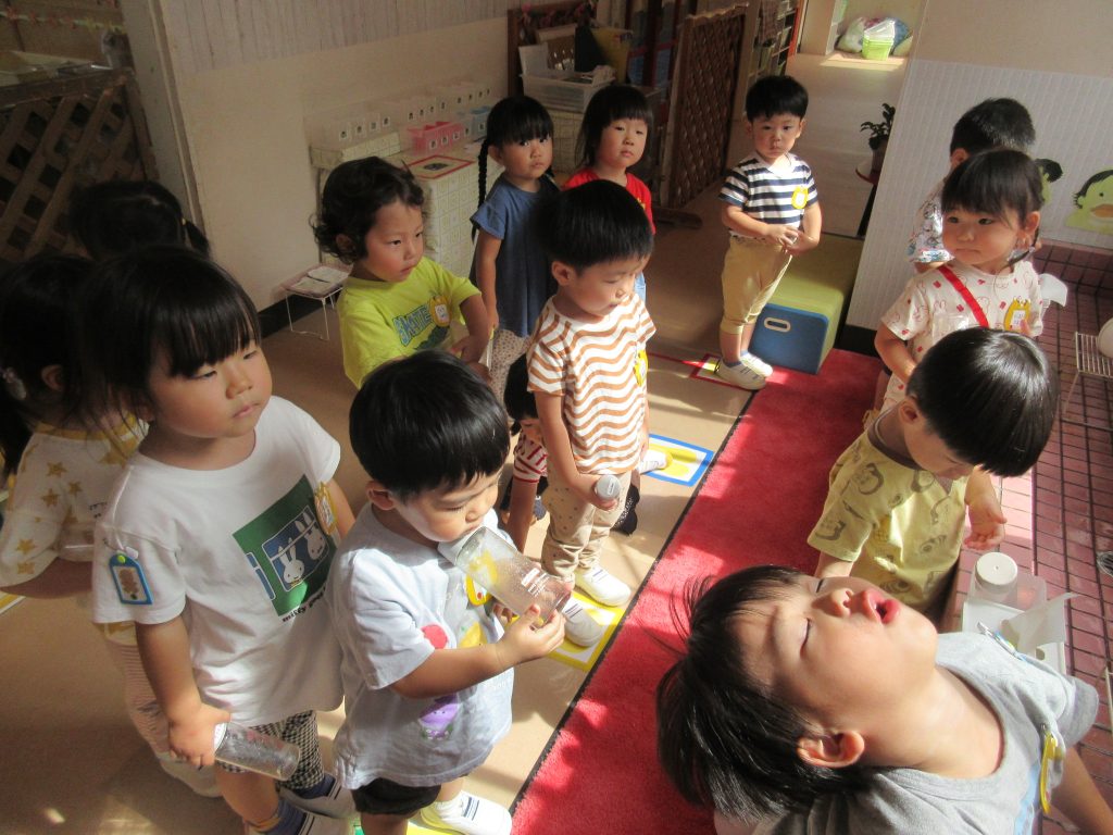 たくさん遊んだあとは、手洗いうがいでばい菌バイバイをして綺麗にします。