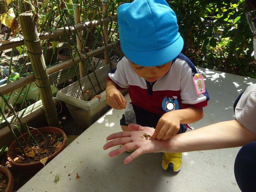 By kazamagakuen2025年9月30日園全体 《うちゅう組》 夏場にたくさん花を咲かせてくれた「アサガオ」の種が取れました。丸い実の中にたくさんの種が入っていて、驚きの子どもたちです。 《のはら組》 お部屋でもパンダのなかよし体操をして遊んでいます♪ 《もり組》 「な~べな~べ そうこぬけ~♪」と歌いながら…くるりんぱっ!お友達と一緒だと嬉しいです。 《ひよこ組》 シールでパンダを作りました。自分だけのパンダ手帳ができました♪