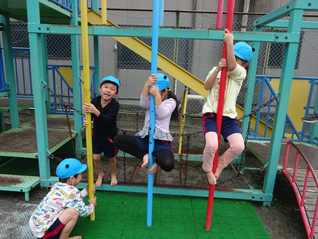 外遊びでは、ジグザグ走リレーや、登り棒も人気です。たくさん体を動かして遊んでいます。