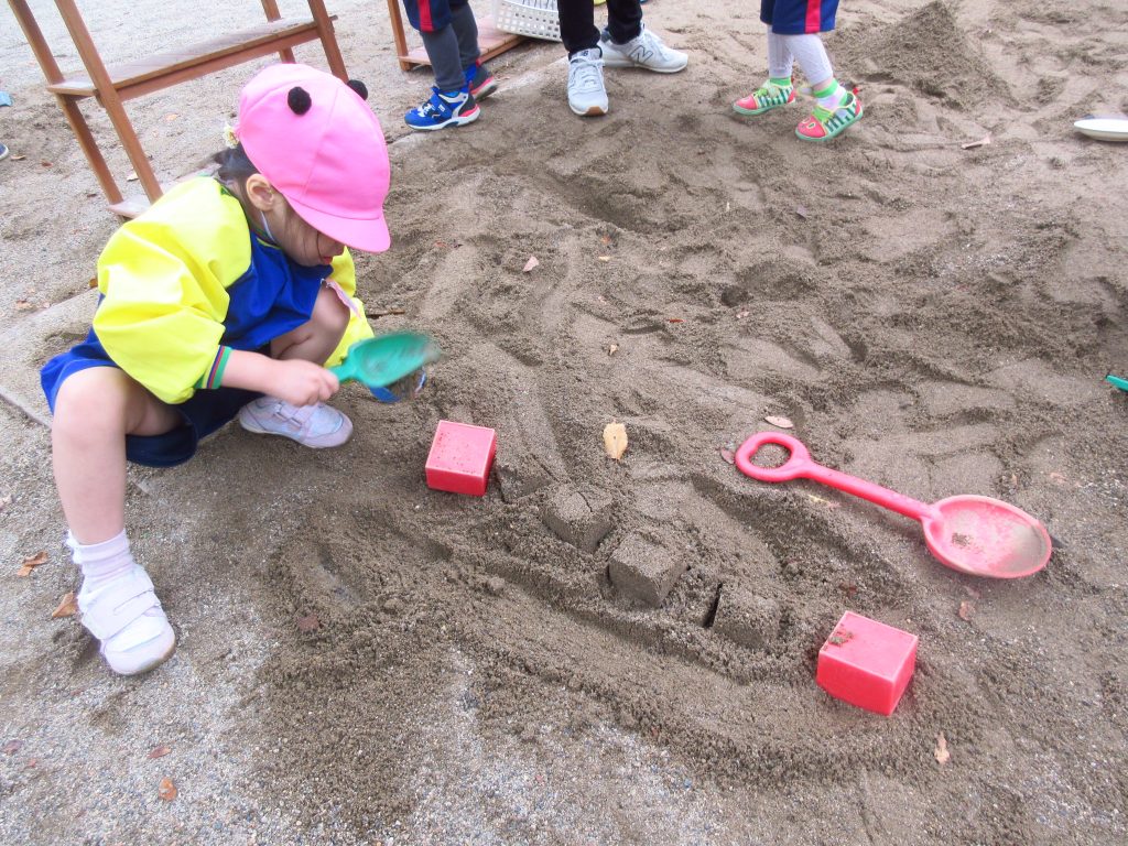 お山から「ヤッホー!」と呼び合いっこをしたり、雨上がりの湿った砂でのケーキ作りも楽しいです。