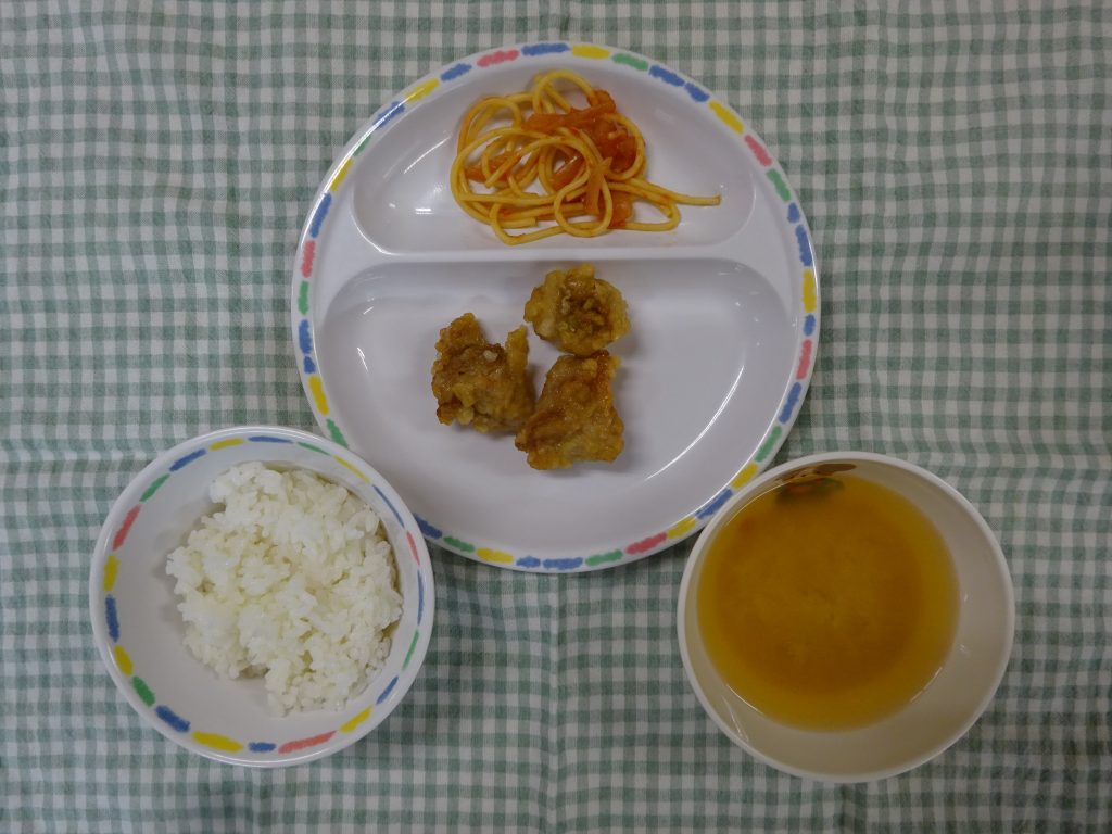 By kazamagakuen2025年10月14日今日の給食 今日の給食です。 今日は、から揚げとパスタでお子様ランチのようでした。たくさん体を動かした後だったので、みんなパクパク食べていました。残すお友だちも少なかったです。