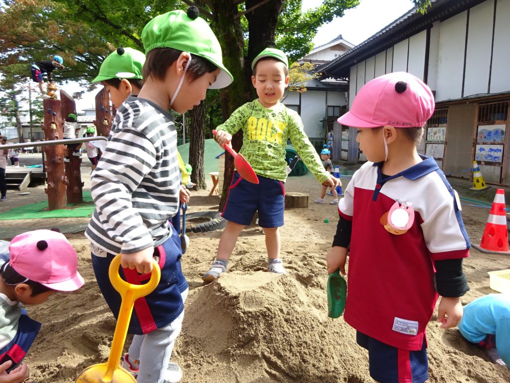 砂場に新しい砂が運ばれてきました。高い山に大興奮!!トンネルを作ったり、山をもっと高くしたりして遊びました。