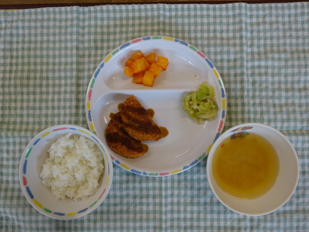 今日のポテトのオーロラソース和えは、ケチャップとマヨネーズのソースでした。見た目は辛そうに見えましたが、食べてみると「辛くな~い」「おいしい」の声がいっぱいでした。