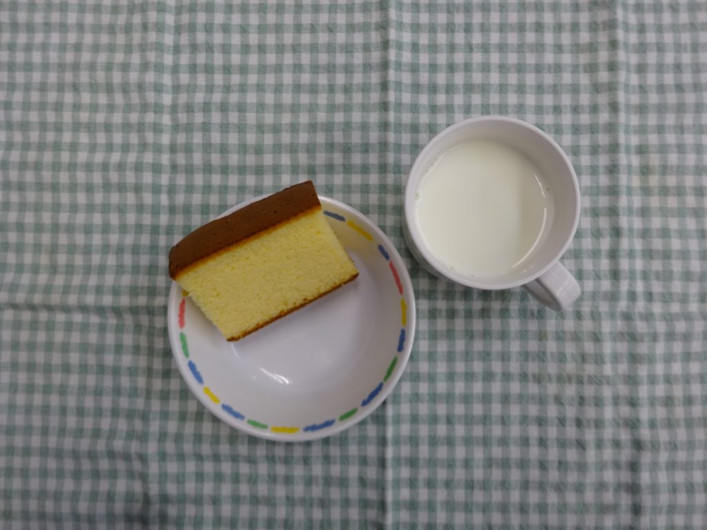 今日と昨日のおやつが都合により交換になります。本日カステラに変更となり、明日りんごゼリーとなります。