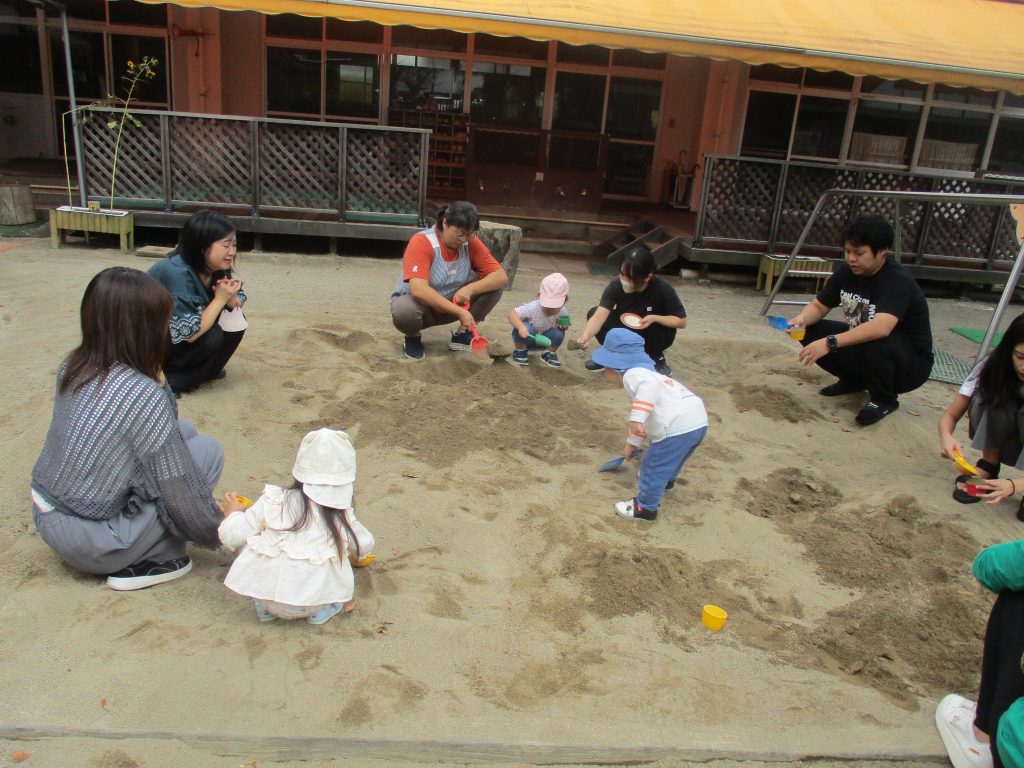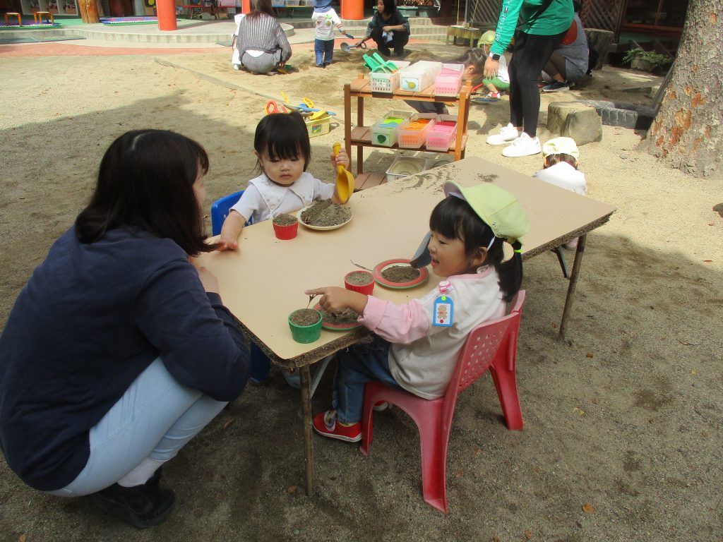 幼稚園のお友だちも、めだかのひろばのお友だちと一緒に遊べるのをとても楽しみにしています。今日も一緒におままごとをしたり、大きなやまを作ったりしました。
