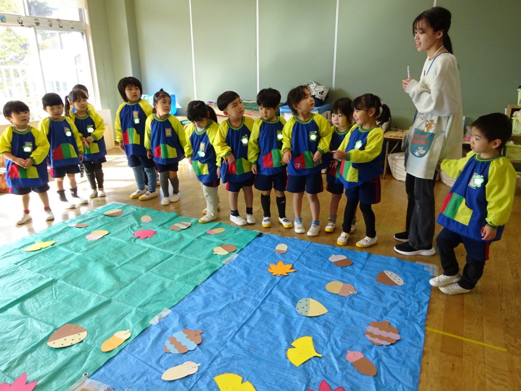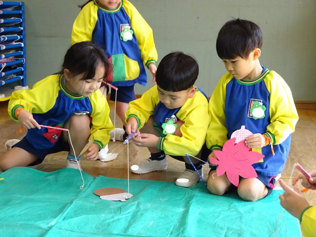 かわいい模様のある木の実や、後ろに虫が隠れている木の実など、いろいろな木の実に磁石を付けて釣って遊びました。