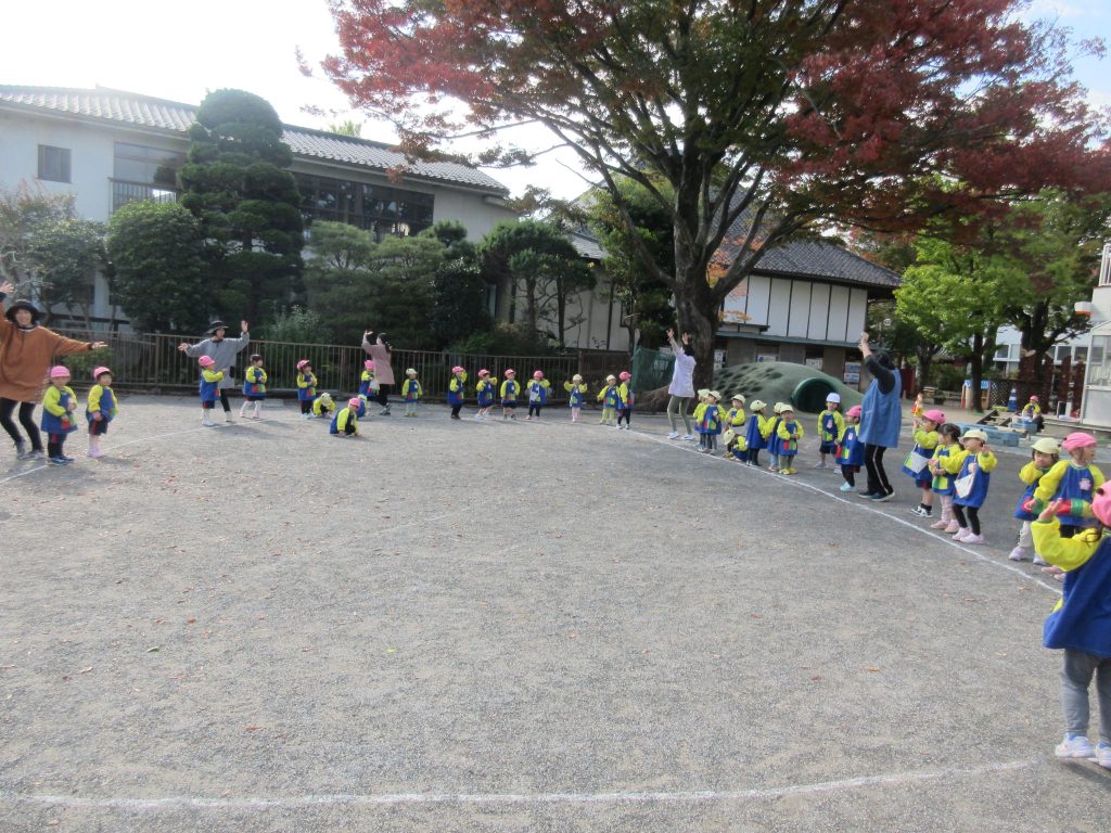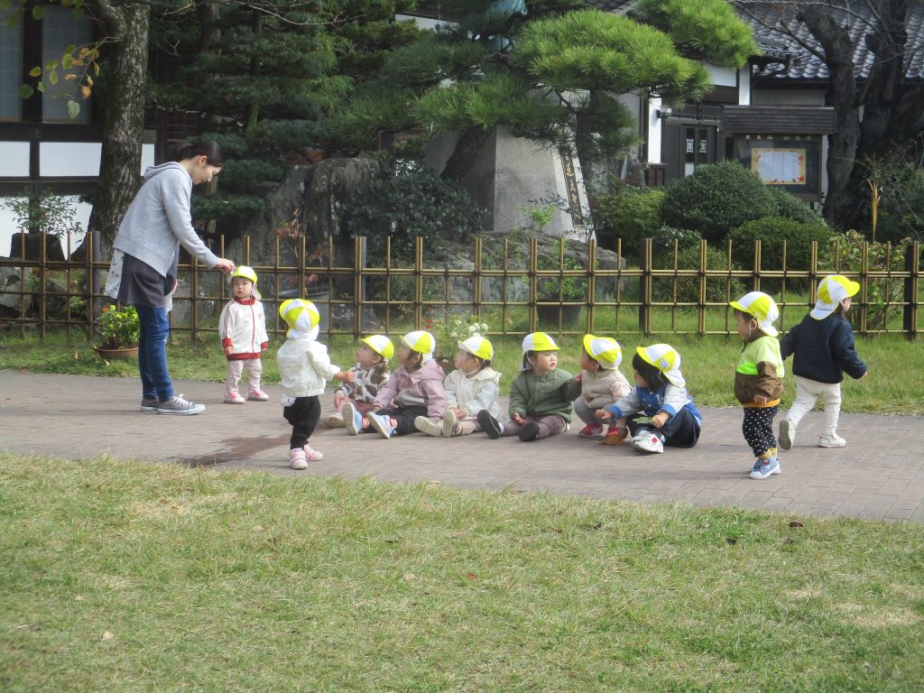 お寺の庭に散歩に行きました。園庭には落ちていない葉っぱを見つけたり、空を見上げてみると…あの実はなんだろう!?と、ザクロの実を発見していました。