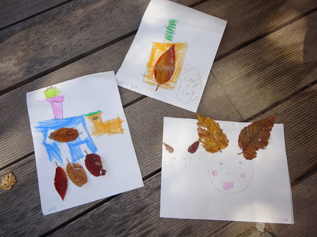 葉っぱがたくさん落ちていたので、いろんな形の葉っぱを貼り合わせたり、絵を描いて遊びました。