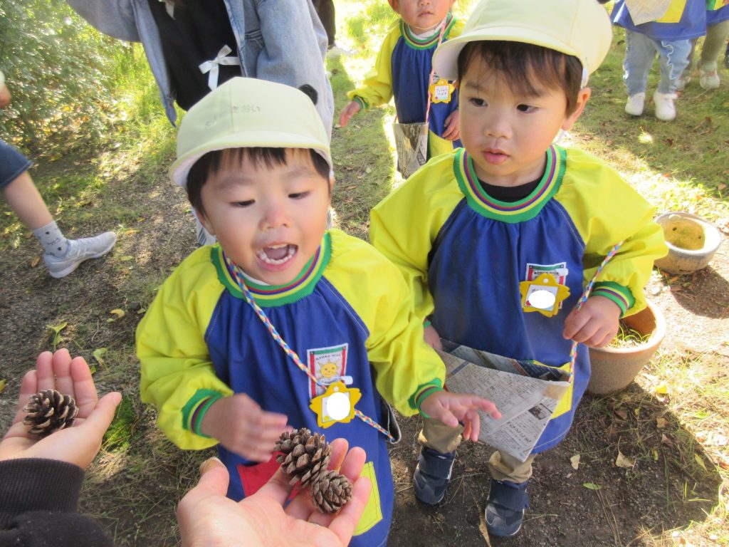 お散歩バックを持って、お寺の庭やぐんぐんのお庭へ秋探しに行きました♪いろいろな色の葉っぱや松ぼっくりを見つけました。今日はキッズのお姉さんたちも一緒に楽しみました。