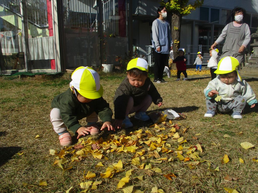 とっても気持ちがいい秋空でした♪「電車だ~」とみんなで手を振ったり、大きな葉っぱを見つけたり、外遊びを楽しみました。