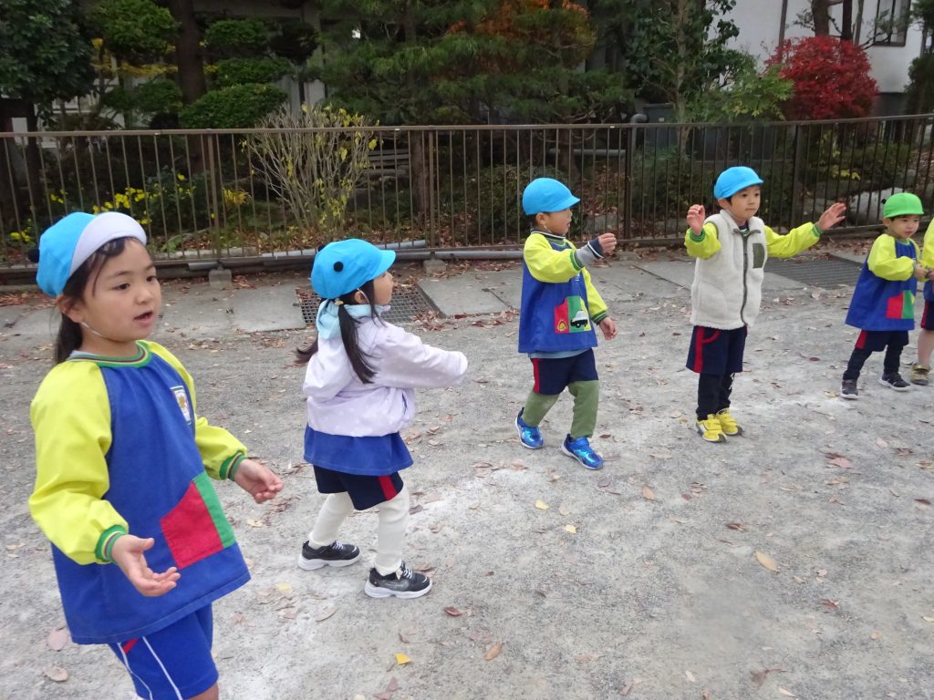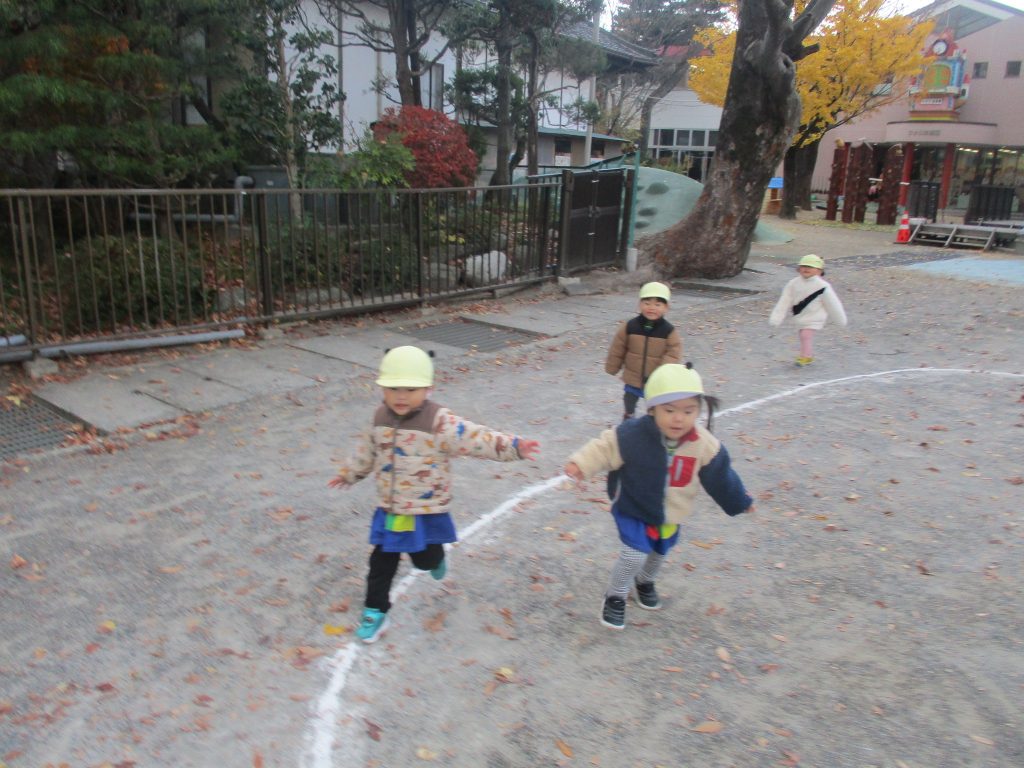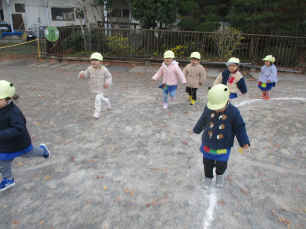 寒くたってきたので、みんなで体を温めてから遊んでいます。うちゅう組さんのマラソンを見ていたので、みんな真似して張り切って走っています♪