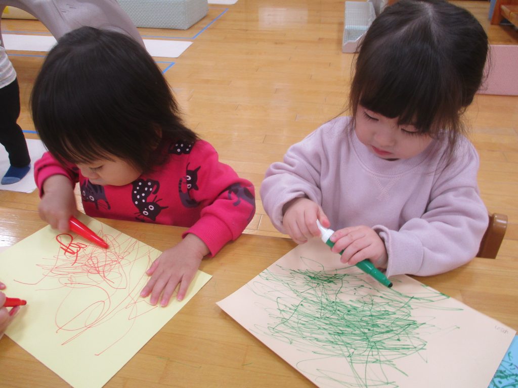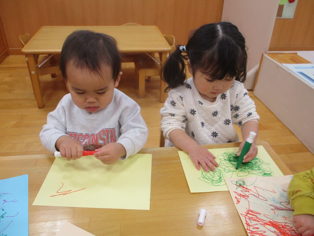 今日は、お部屋でお絵描きをしました♪好きな色のペンを持って、画用紙いっぱい描いて楽しみました♪