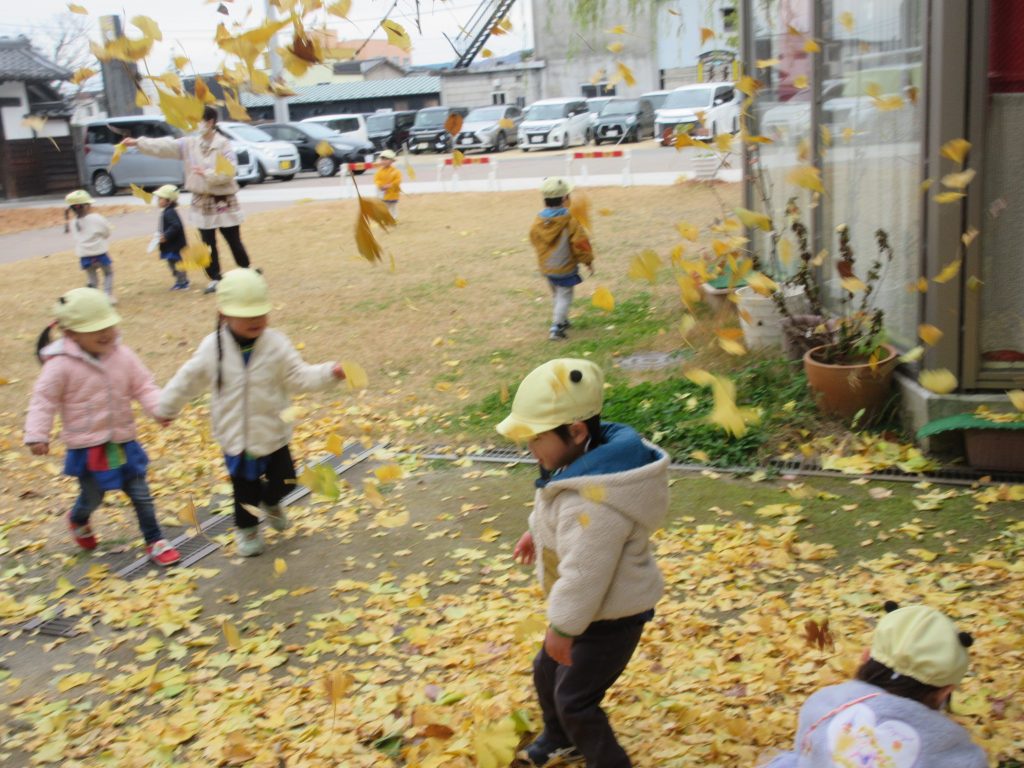 ぐんぐんのお庭に落ちている銀杏の葉っぱをたくさん集めました。「幼稚園の葉っぱよりも大きいね~!」と大きさを比べたり、顔を隠して遊びました。