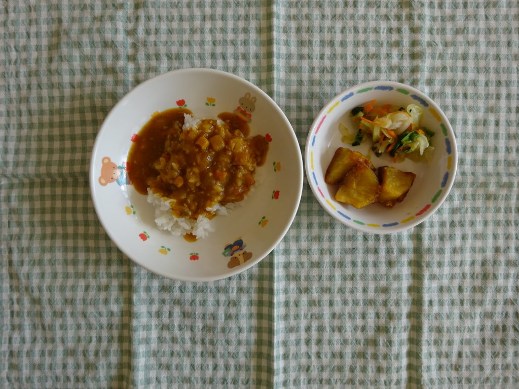 By kazamagakuen2025年11月28日園全体 今日の給食です。 今日のカレーライスにはコーンが入っていて“とうもろこしだ!”と喜んでいました。 さつまいもも甘くておいしいね~とお友だちと話している子もいました。