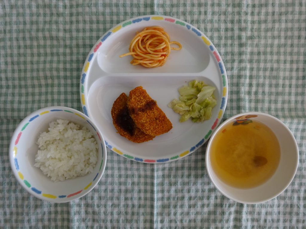 今日の給食です。今日は完食する子も多く、おかわりも人気のメニューでした。キャベツは胡麻ドレッシングの味がまろやかで食べやすかったです。