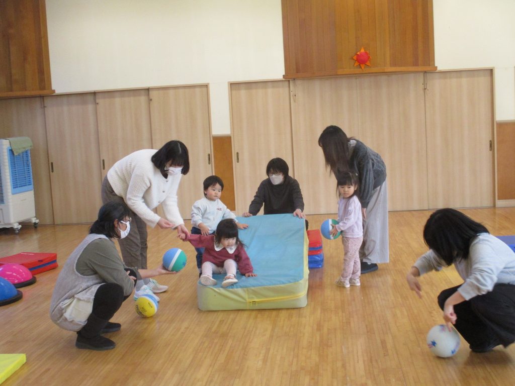 わいわいコース。堀内先生と運動あそびをしました。転がっているボールを目で追うこと…自然にやっていることが成長してから『ボールをキャッチすること』につながっていくそうです。
