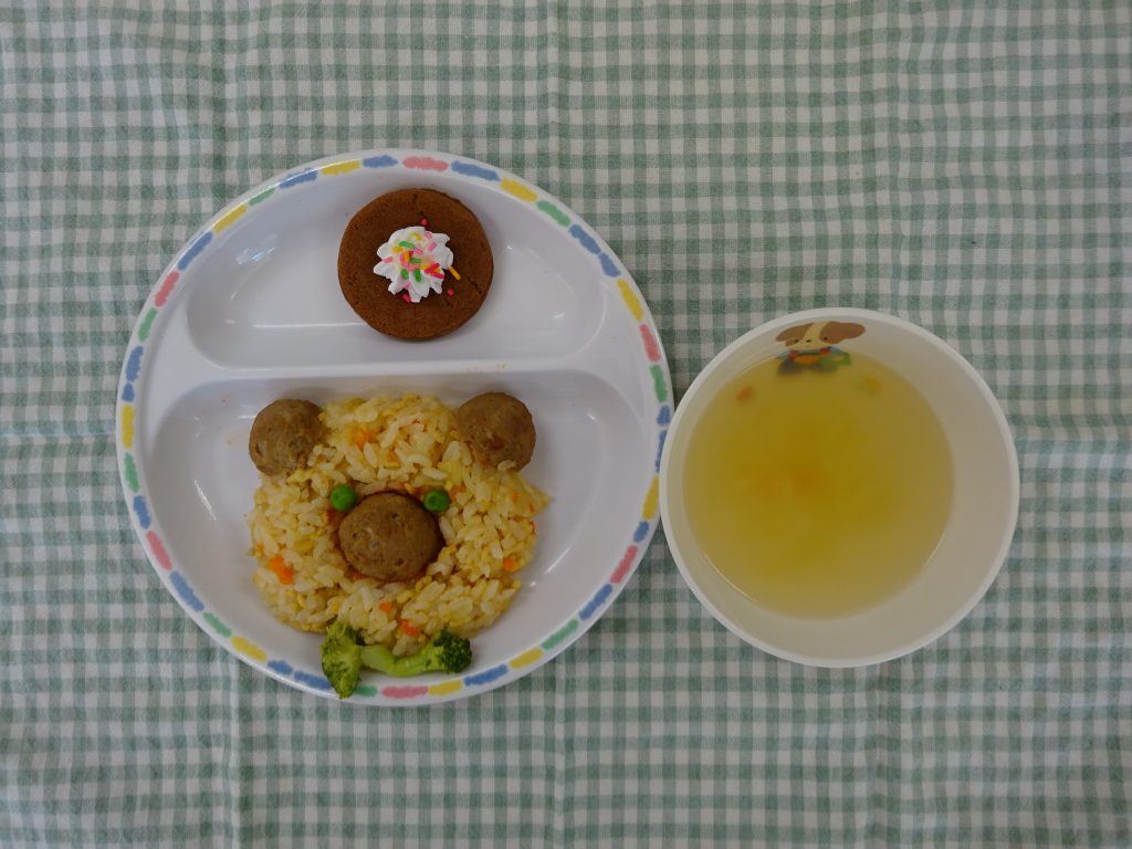 今日は、お楽しみメニューの日でした。ピラフと肉団子でくまさんの顔になっていて、みんな大喜びでした。うちゅう組は、自分で顔を作り思い思いのお子様ランチができあがりました。