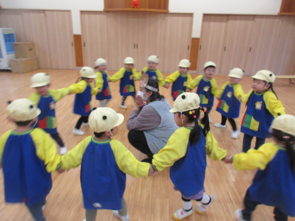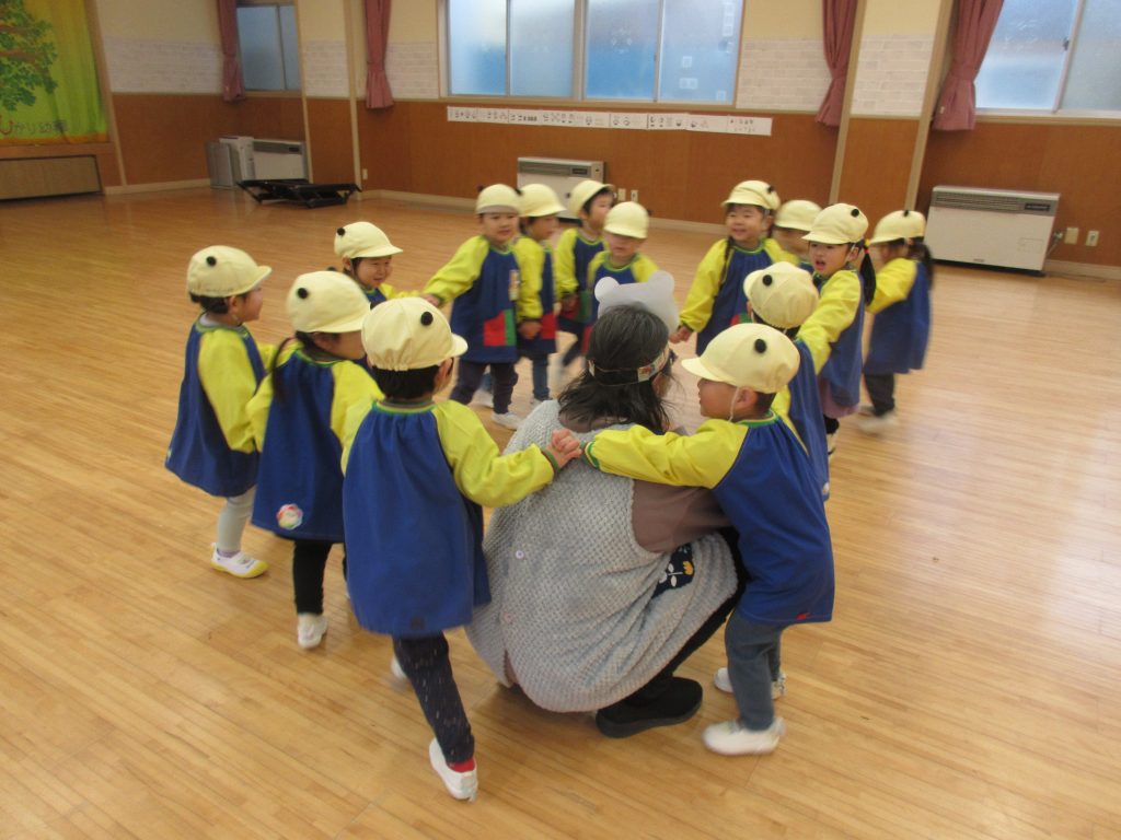ホールでむっくりくまさんの鬼ごっこをしました。ルールがわかるようになり、みんなで楽しんでいます♪