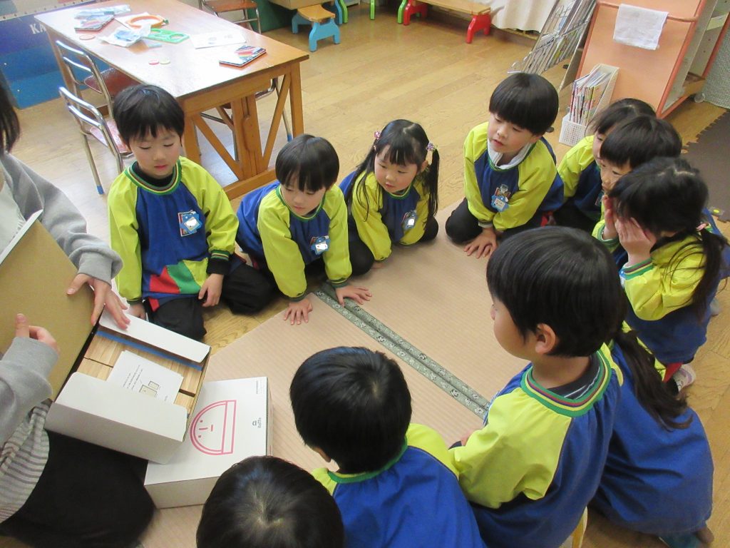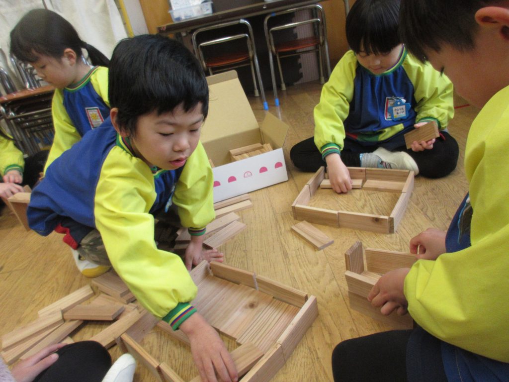 ステアリテール株式会社(旧NEC)さんから木のおもちゃを頂きました。かまぼこの板を使って遊ぶおもちゃです。杉の木の板を使っていて、においをかいだり、木と木を叩いて音を楽しんだり…積み木にして遊びました。冬休み明けもみんなで遊びましょうね。