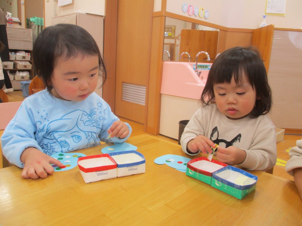 寒くなってきたので、手袋をつくりました。シールを貼ることが楽しくて、みんな夢中でした♪