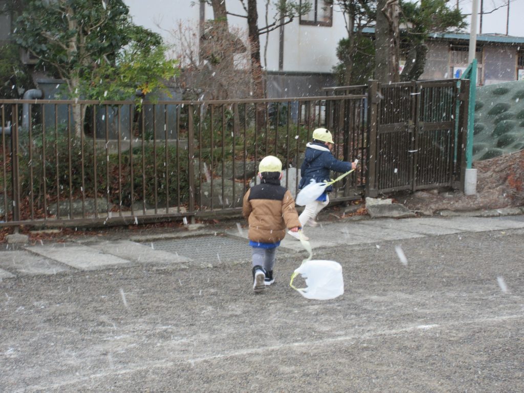 ちらちら降る雪に大喜びのみんなでした♪凧あげをしたり、追いかけっこをしたり、体を動かしてぽかぽかになりました。