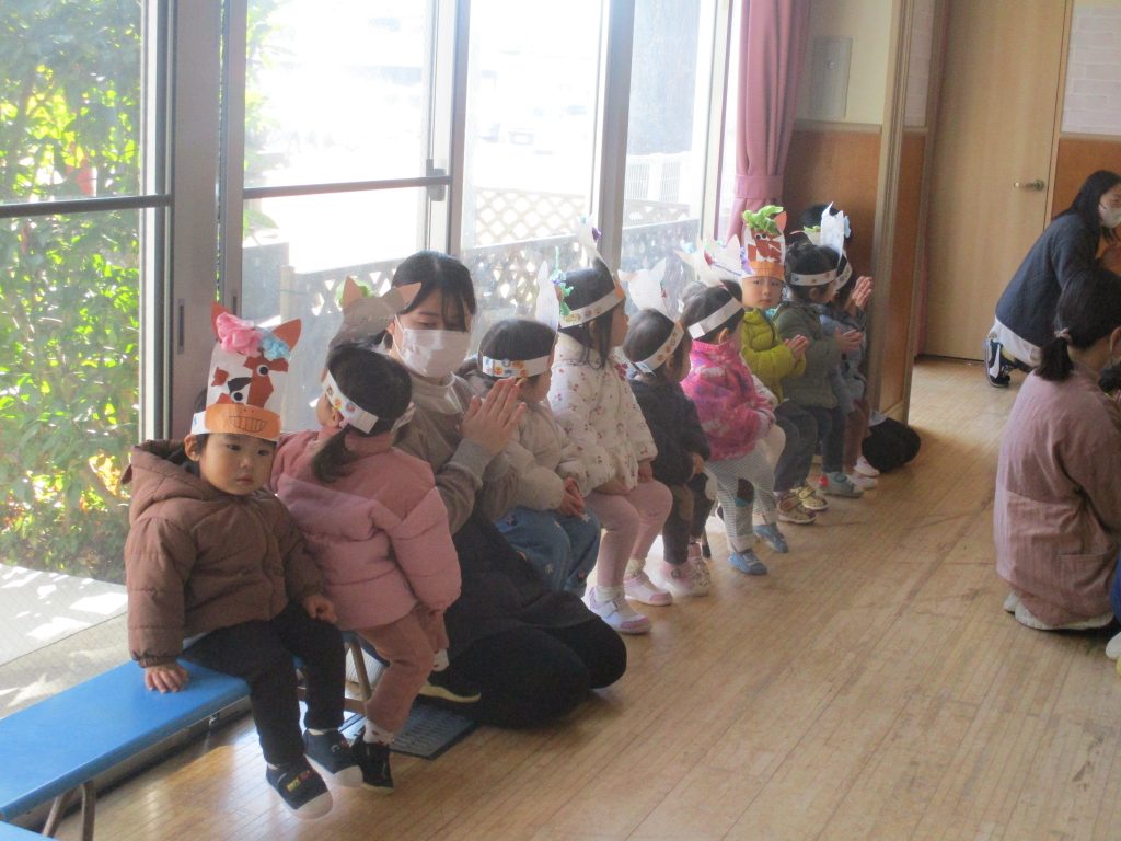 獅子舞も遊びにきてくれました。ちょっと怖くて、後ずさりしているお友だち、勇気をもって頭をかんでもらっているお友だち、びっくりしながらもじーっと見ているお友だち…いろいろな楽しみ方をしていました。