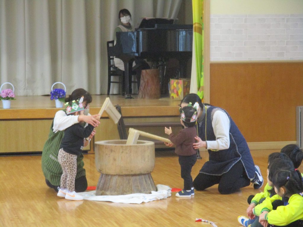 お誕生日のお友だち、みんなでおもちつきをしました。