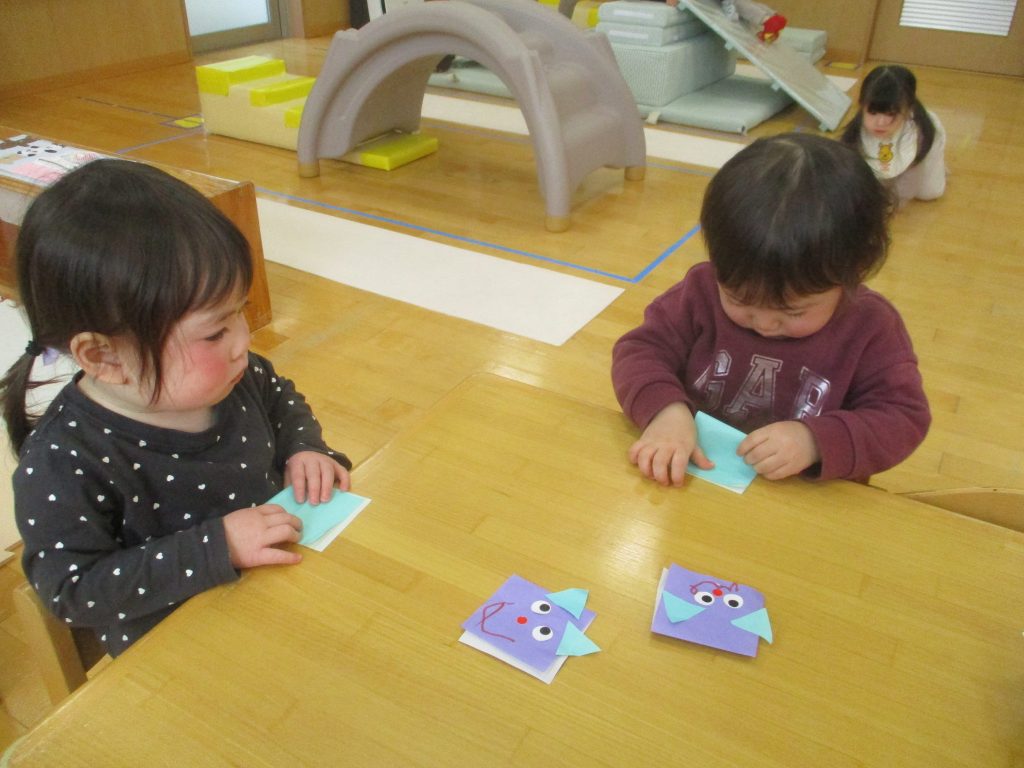 みかん組では、折り紙を半分に折って、動物作りを楽しみました♪目のシールや、耳の形を自分で選んで
