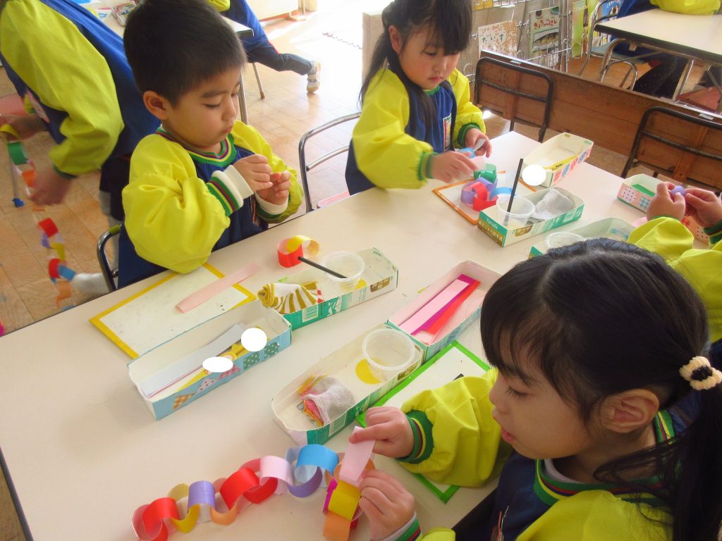 もうすぐみんな一つ大きくなるね!お祝いのお部屋を作ろう♪と輪つなぎを作り始めました。