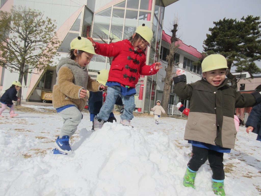 ぐんぐん側のお庭で、雪遊びをしました。雪山に上ったり、雪玉をつくったり、手形をつけて遊びました。