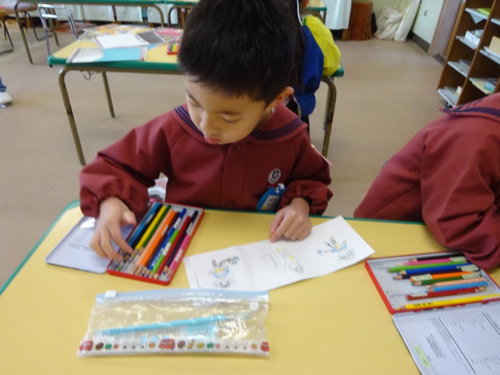 1年生になったら使える「えんぴつ立て」を作っています。幼稚園で楽しかったことを、思い思いに描きました。