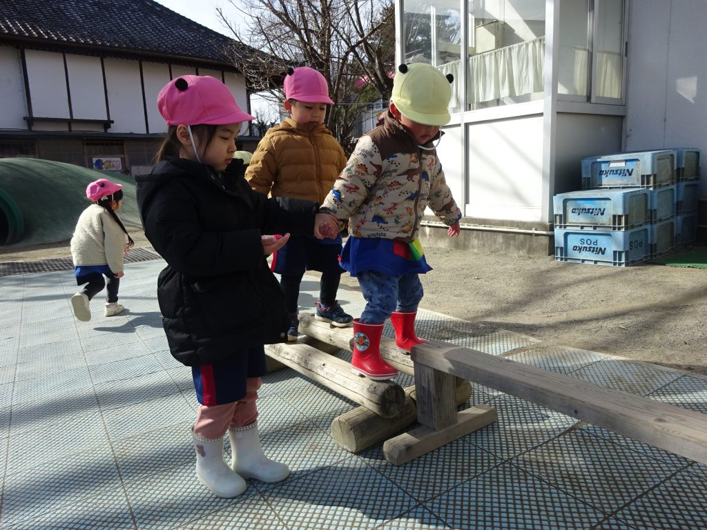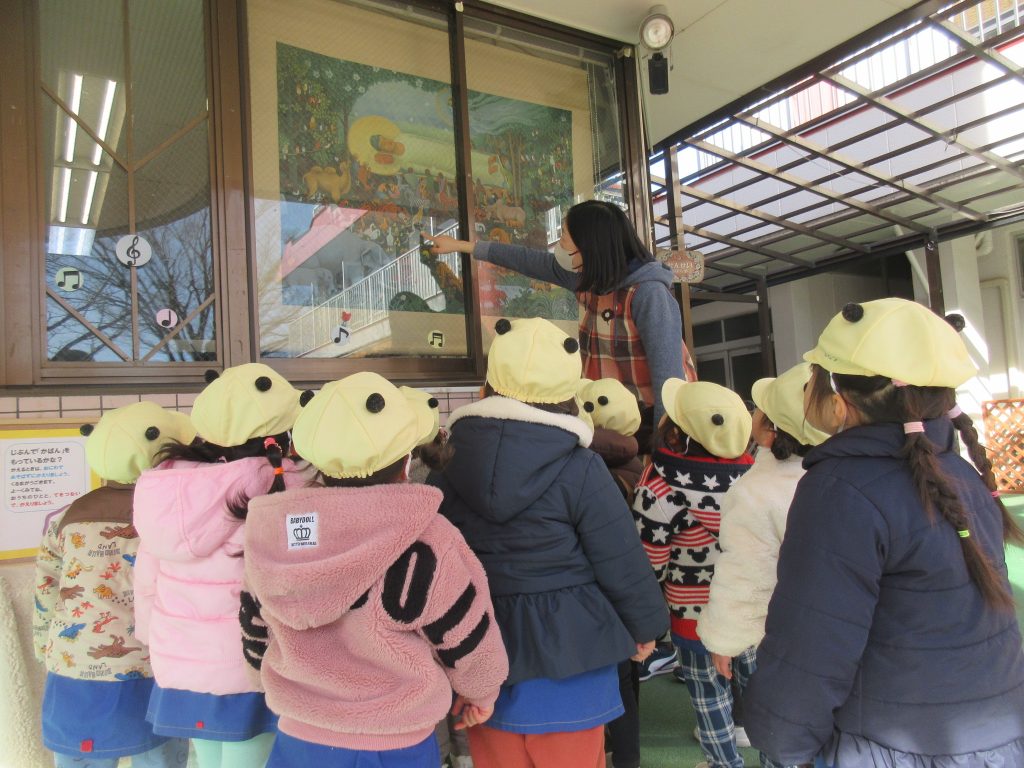 外に行く前に、職員室前に飾られた涅槃図を見ました。「鬼もぞうさんも泣いている・・・」とじっくり見ていました。金曜日本堂に行き手を合わせてきます。外では、ぶら下がったり、足をかけたり、鉄棒にチャレンジするお友だちが多かったです♪