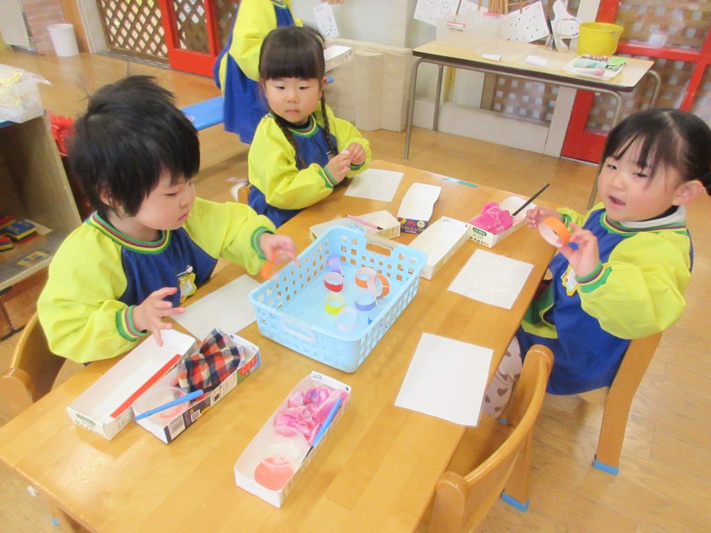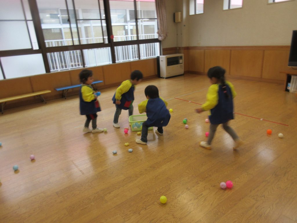 久々の雨でしたね。「雨の日は傘させるからうれしい!」という声も聞かれたひよこ組です。じっくり輪作りをしたり、ボール集め競争をして体を動かしたりしました。