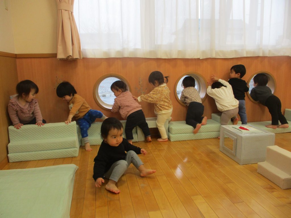 いちご組では凸型の台や平均台を壁側にくっつけて、バランスを取りながら進んだり、体を動かすのを楽しんで