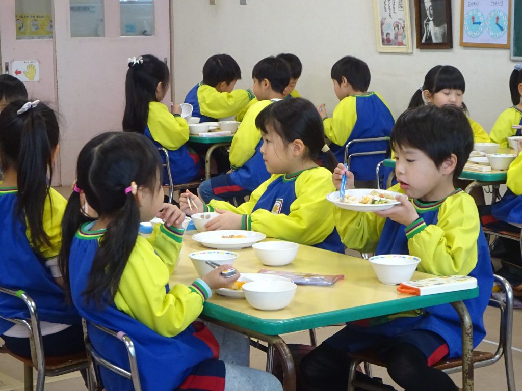もうすぐ1年生のうちゅう組。「お皿を持って食べようね」「こぼさないで食べられるかな?」食事のマナーを確認しながら食べています。残さないで食べられるようになり、いろいろな食材が食べられるようになったなあ・・・と感心です!!