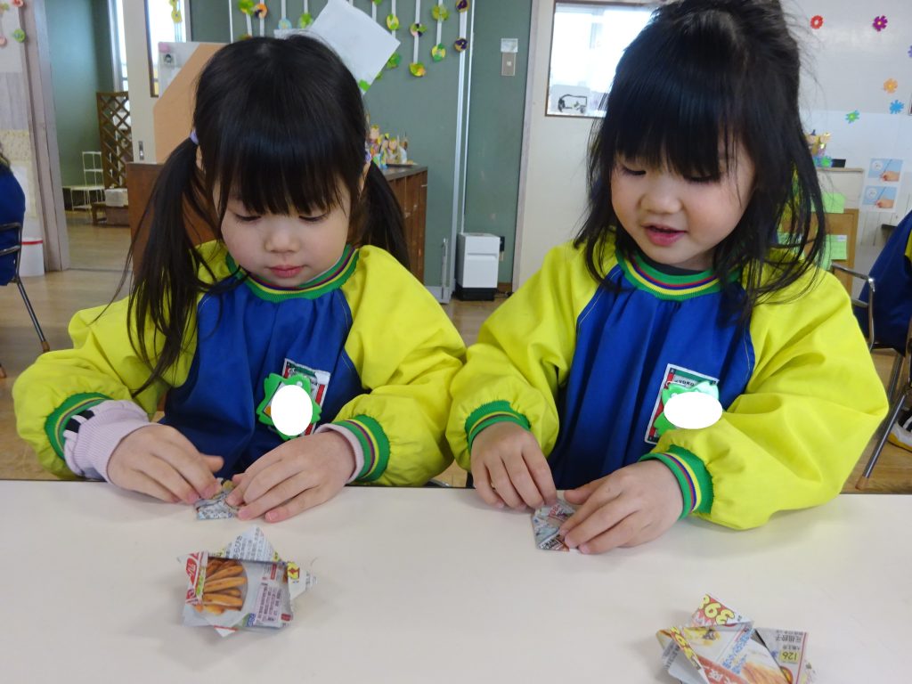 折り紙でお花やパックンチョなどいろいろな形を折って楽しんでいます。