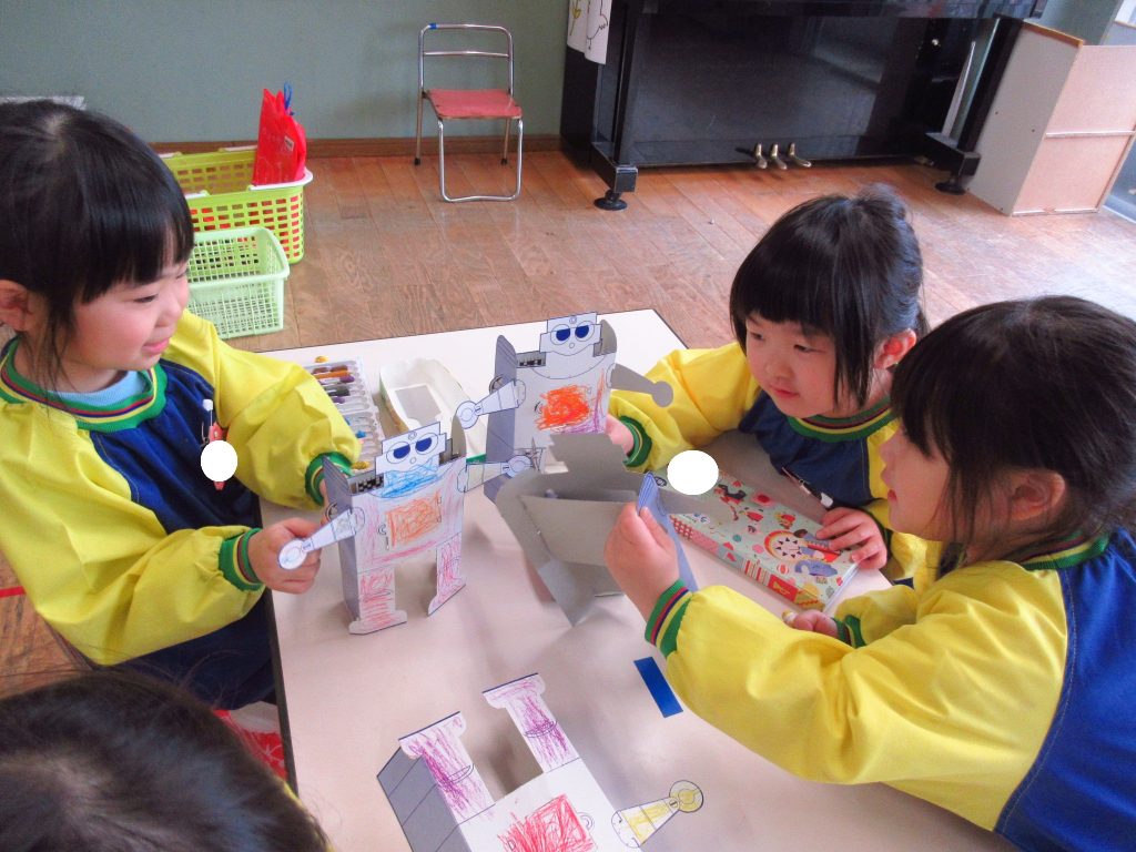 もり組は立体のロボットを作って友達とお話ごっこをして遊びました。
