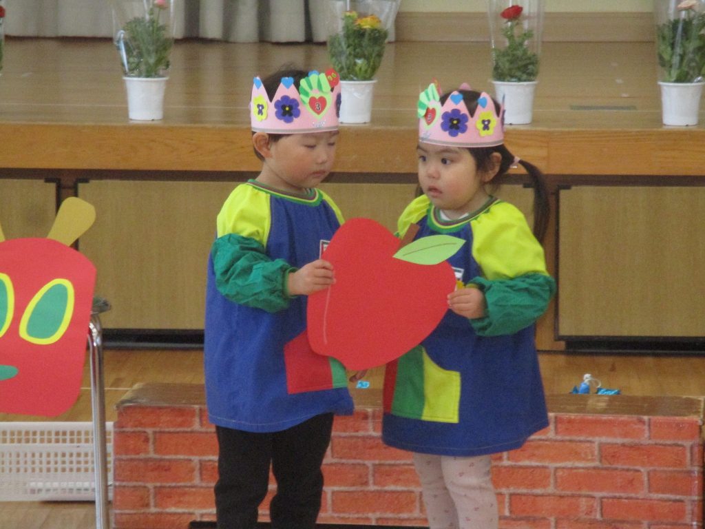はらぺこあおむしになって、おいしい果物を運んできてくれた誕生日のお友だち。果物をたくさん食べた後はきれいなちょうちょになりました♪